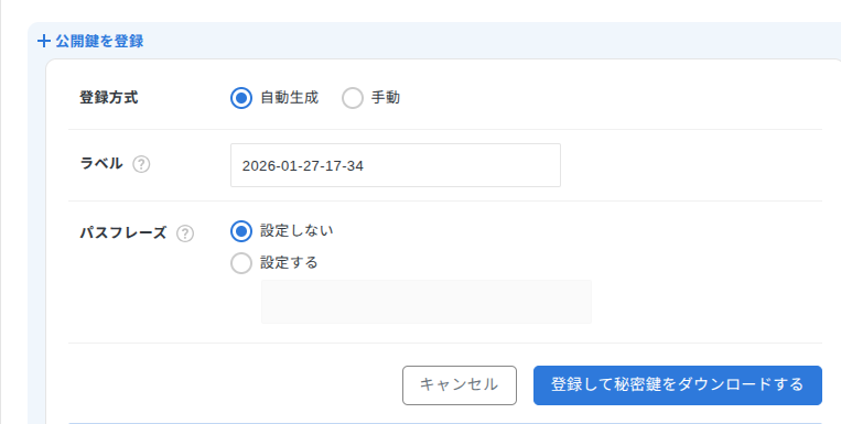 登録方法: 自動生成を選択して『登録して秘密鍵をダウンロード』をクリックすると公開鍵をXserverの.ssh/authorized_keyファイルに登録してくれて、秘密鍵を生成してくれてダウンロードしてくれます。 これが一番簡単。